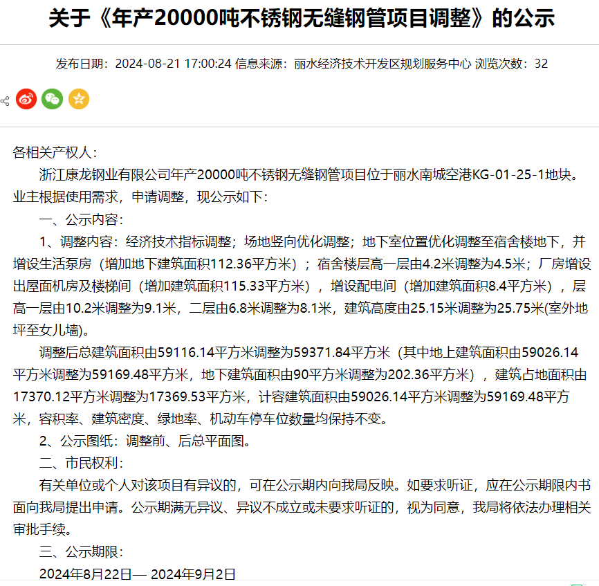 8月22日,浙江康龙钢业有限公司年产20000吨不锈钢无缝钢管项目调整公示,公示期:2024年8月22日-2024年9月2日。